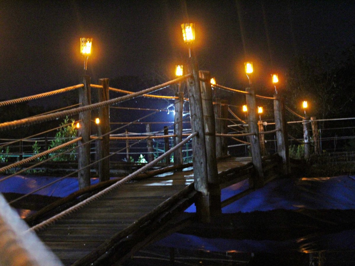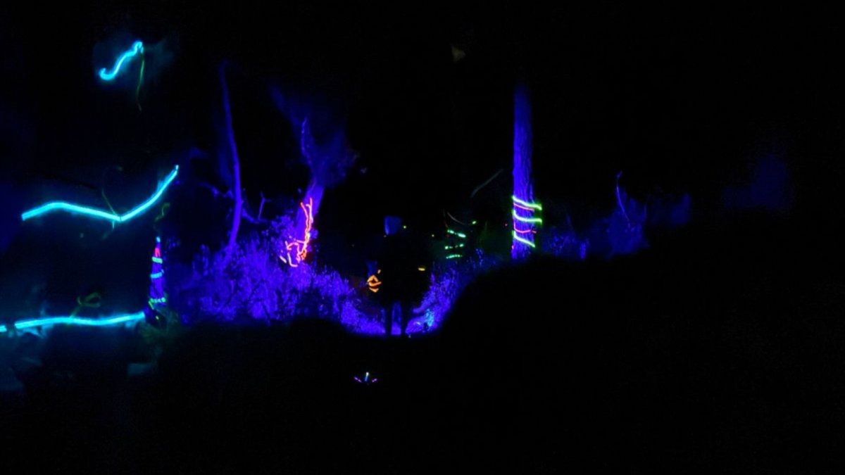 Un camino nocturno lleno de colores, luces y fantasía que te invita a caminar, explorar y descubrir la magia entre árboles y naturaleza.